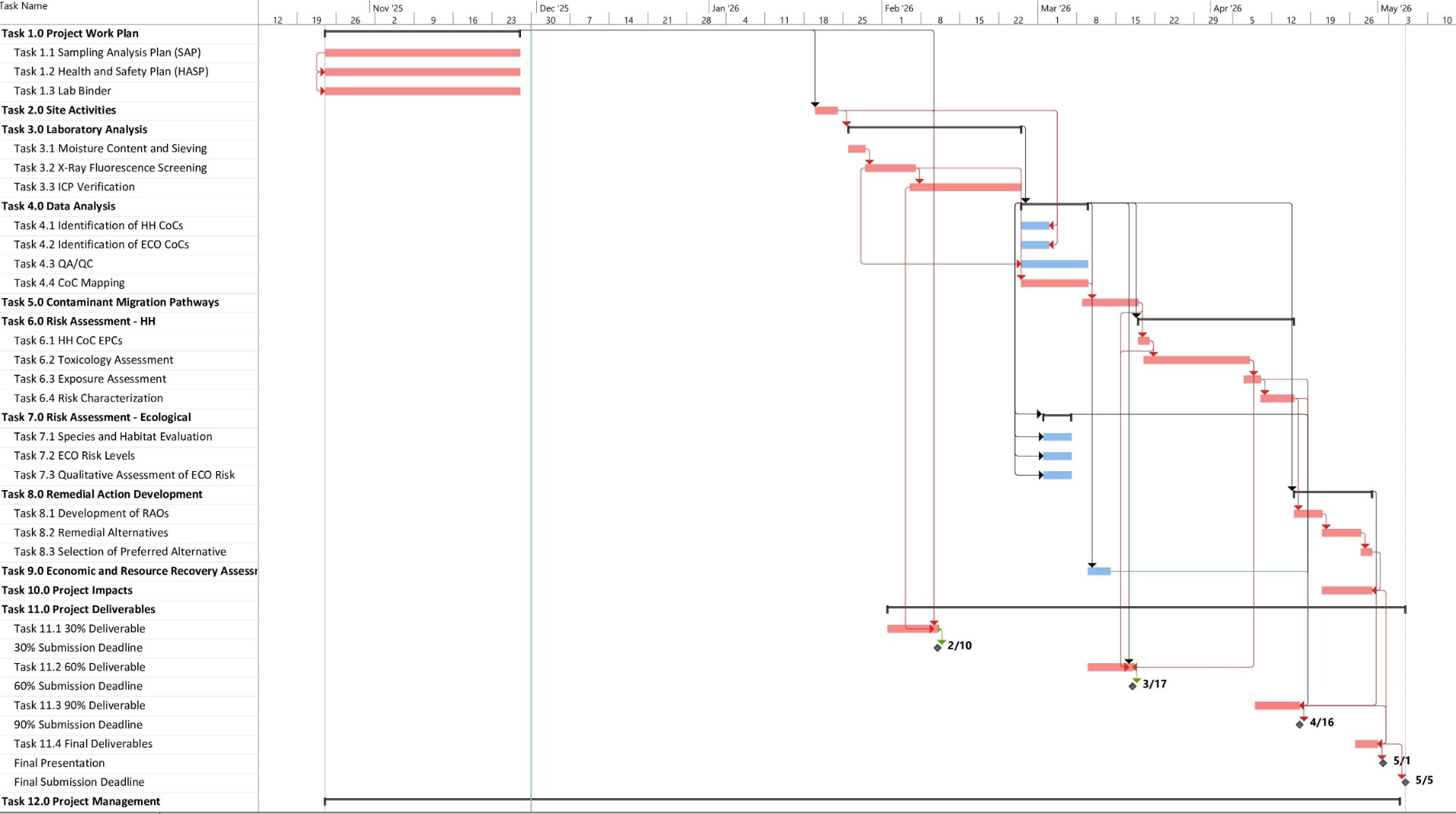 The figure below displays the project timeline. This project began on October 24, 2025 and is completed on May 5, 2026 for a total of 137 days. This timeline excludes all weekend dates and school breaks as the team will not be completing work during these times.