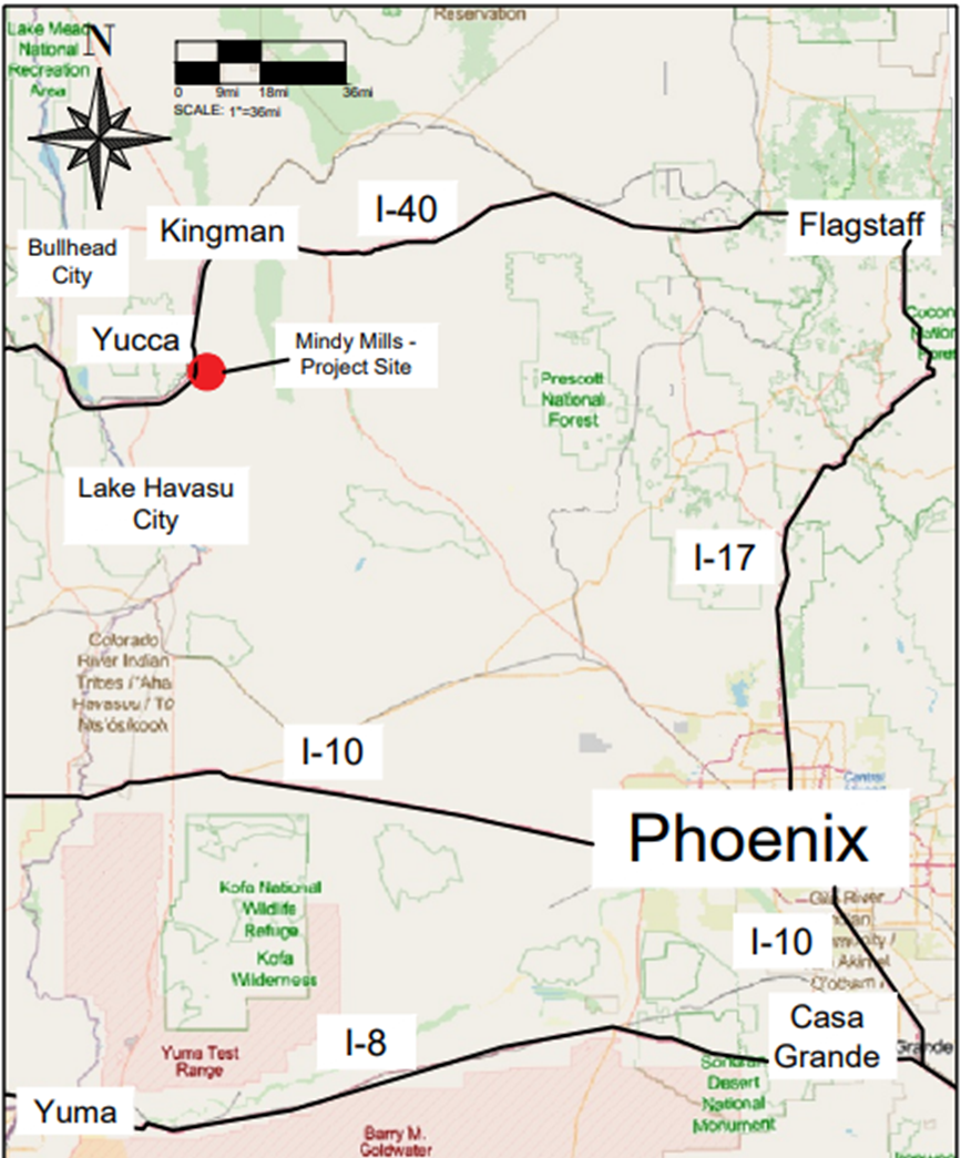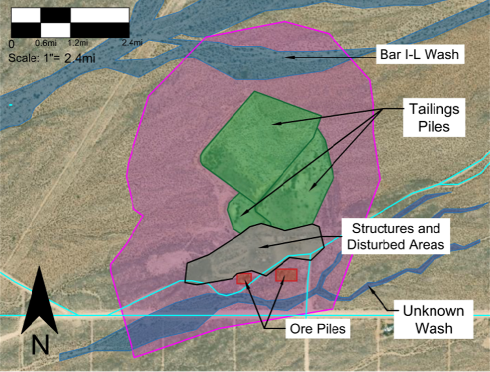 Figures 3-5 below display the Mindy Mill site location, the mines and towns in the vicinity, and the site itself including labelling of notable structures and washes around the site.