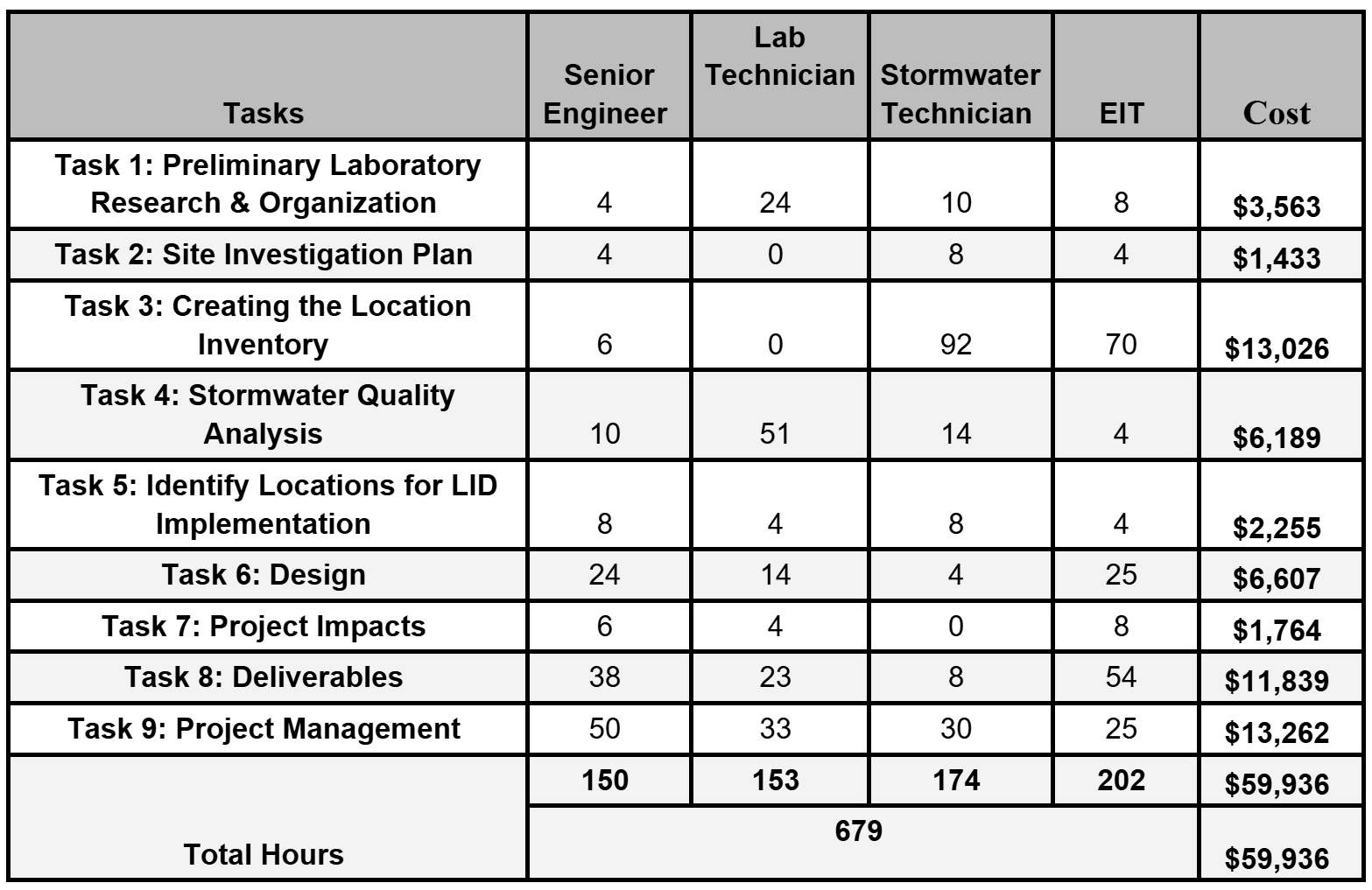 Below is the cost breakdown by task and role for billable services