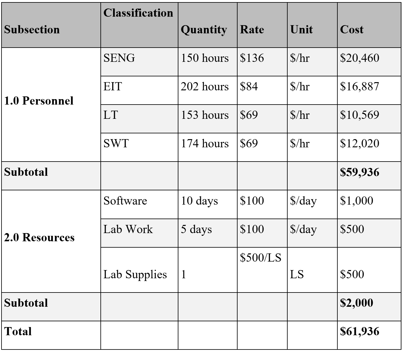 Below is the total cost of engineering services including the billable services and resources costs. The expected total cost is $61,936