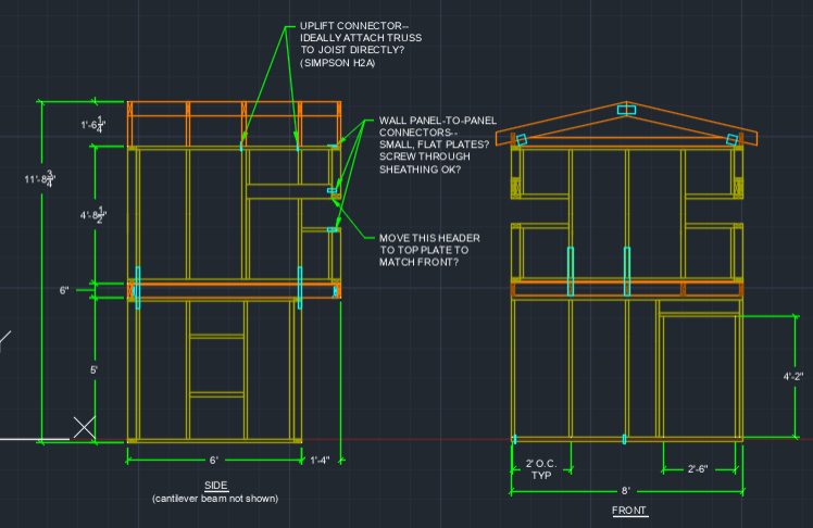The design alternatives shown below include sketches. This primarily consists of roof brainstorming. These drawings do not include windows or structural framing for the first and second floor. Design 1 incorporates a simple truss roof with a king post and overhang on both sides of the structure. Design 2 consists of a monoslope roof with overhang on both sides. Design 3 also incorporates a roof truss and king post design, but includes more truss members. The truss roof hangs over both sides of the structure.