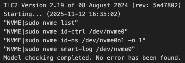 We convert formal specifications into executable NVMe test sequences and run them with a safe, repeatable workflow.