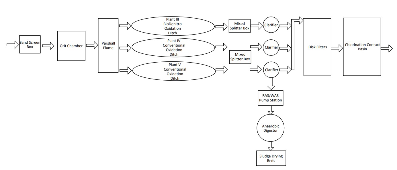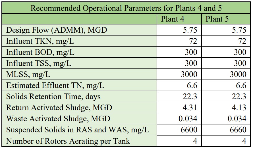 The oxidation ditches for Plants 4 and 5 will be converted to a new conventional operational style with an anaerobic denitrifying zone. Each plant will be divided into two separate tanks. The return activated sludge (RAS) flow rate will be adjusted to 75% and the waste activated sludge flowrate will be changed to accommodate the RAS rate. Each tank will run four of its rotors as aerators to supply oxygen for nitrification, while the rest will be submerged to move flow through the anaerobic zone. With these changes it estimated there will be an effluent total nitrogen concentration of 6.6 mg/L, below the permit level of 8 mg/l. It is expected that almost all of the soluble BOD will be consumed and removed. Under these conditions it was determined that the secondary clarifiers would be slightly overloaded, but it was determined that it would be more cost effective to delegate more stress on the disk filters and replace them more often than retrofit the clarifiers. A summary of the operational parameters as well as a diagram of the proposed changes can be found below.