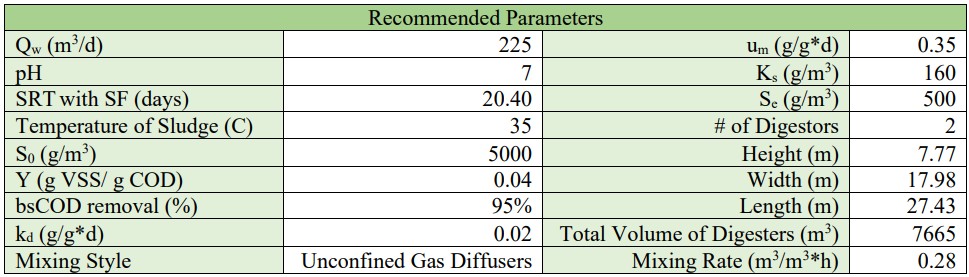The volume of the existing aerobic digestors would allow for 225 cubic meters of sludge per day to be digested once they were retrofitted to anaerobic digestors. This would produce around 340 cubic meters of methane per day, which once sold could generate $157,000 in revenue. The construction would require the instillation of: a heat exchanger, mixing system, gas collection system, and air scrubber. The system could be operated at 35 degrees Celsius and it was determined that there would be sufficient methane produced to heat the system and turn a profit. A table showing recommended design parameters as well as diagrams of the digestors can be seen below.
