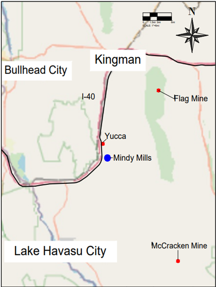 Figures 3-5 below display the Mindy Mill site location, the mines and towns in the vicinity, and the site itself including labelling of notable structures and washes around the site.