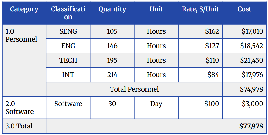 The total cost to complete the Bellemont Roadway Alignment design is shown in Table 5-1. The cost includes personnel that is subdivided based on classification, with projected hours and rates. These billing rates were compiled in reference to local Flagstaff engineering company rates. Additionally, software usage is included based on the tasks shown above that utilize software. The software was billed at a rate of $10 a day to cover a ratio of the team’s yearly software expenditure. The cost excludes travel, as Bellemont is within a non-payable distance of travel. The total cost, based on personnel and software, is approximately $80,000.