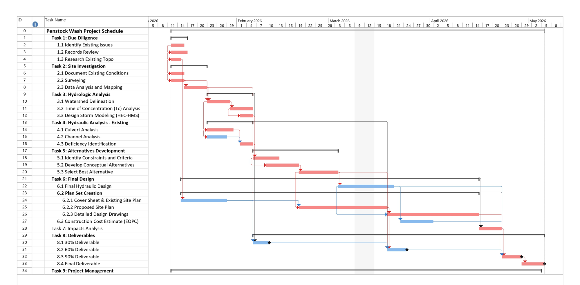 An evaluation of the surrounding watershed runoff with seasonal rainfall and snow melt will be conducted against existing infrastructure to identify preliminary design alternatives. Designed improvements through hydraulic, hydrological analyses will comply with appropriate local, state, and federal regulations.
