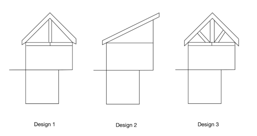The design alternatives shown below include sketches. This primarily consists of roof brainstorming. These drawings do not include windows or structural framing for the first and second floor. Design 1 incorporates a simple truss roof with a king post and overhang on both sides of the structure. Design 2 consists of a monoslope roof with overhang on both sides. Design 3 also incorporates a roof truss and king post design, but includes more truss members. The truss roof hangs over both sides of the structure.