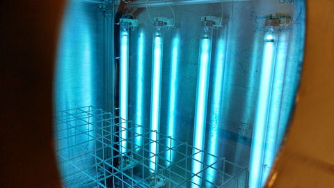 Using an array of UV lights will allow the chamber to sanitize various materials but only their surfaces. They take the same about of power as other florescent bulbs using about 20W per bulb. This technology is already used in hospitals to sanitize whole rooms in about 4 minutes.