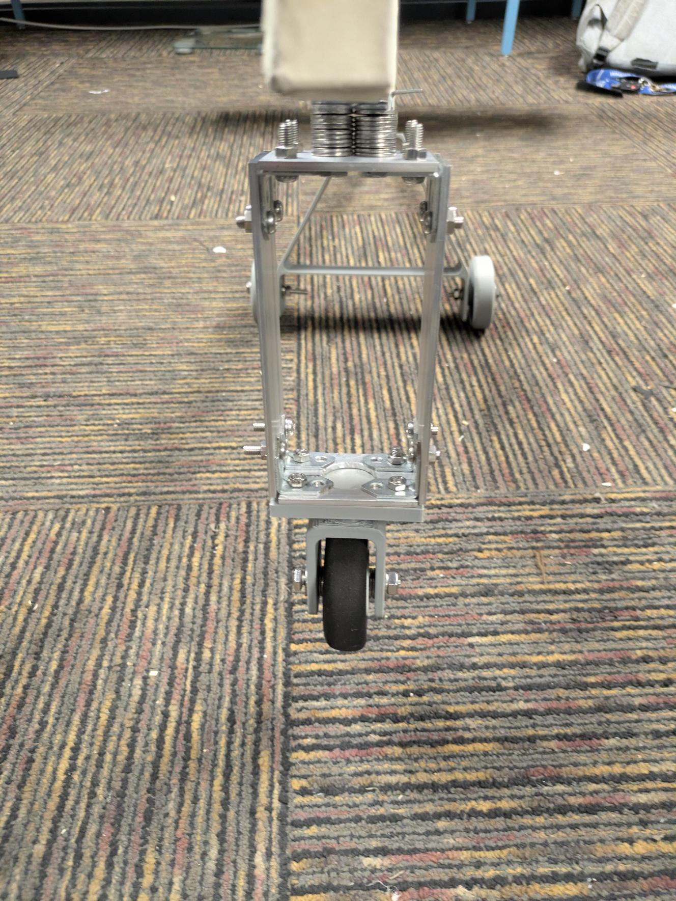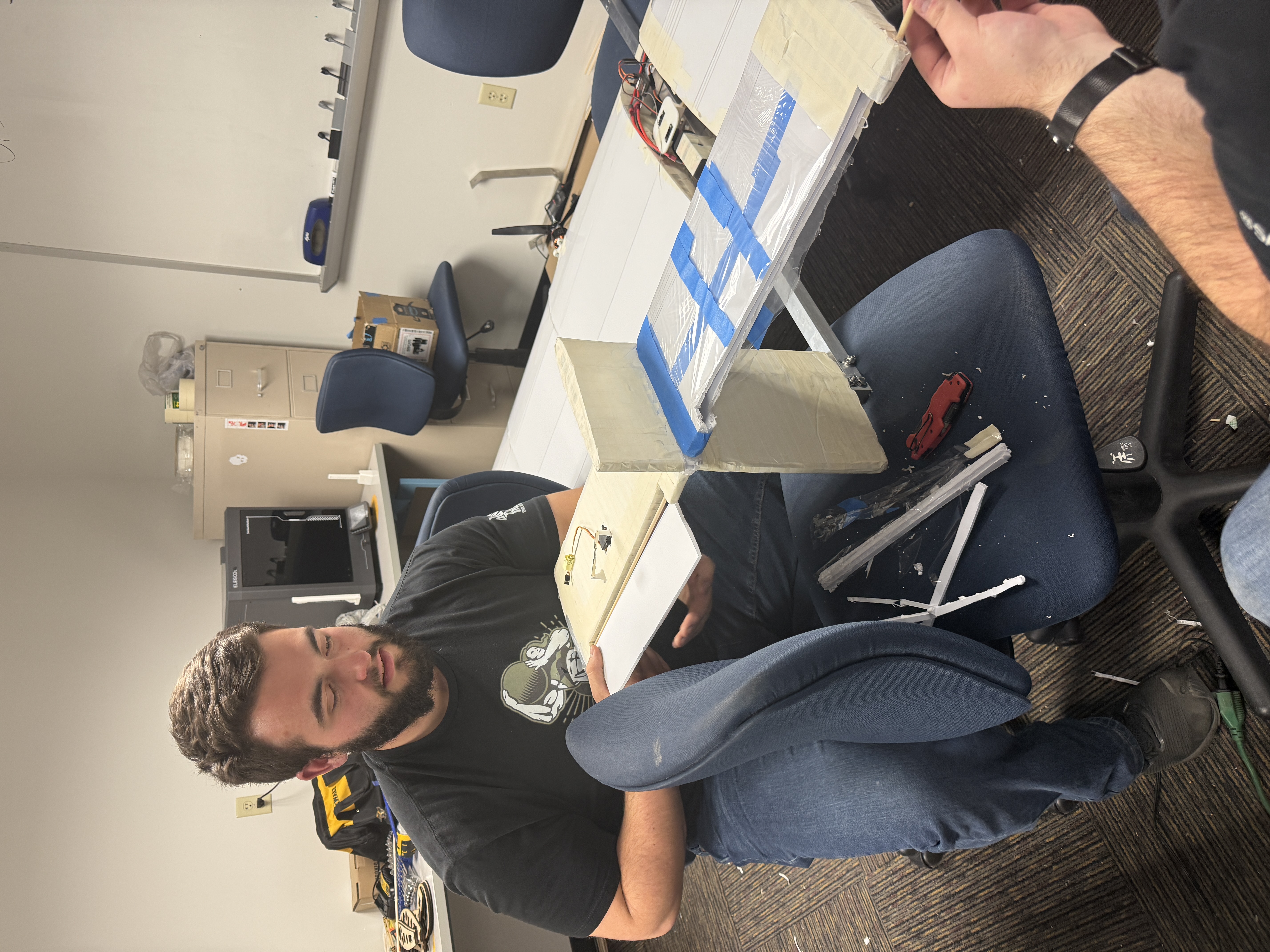 Created a new prototype using foam board and shrink wrap. Reiterated on landing gear as our new design broke during a teakeoff attempt.